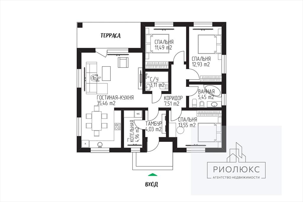 - просторная кухня-гостиная 35,5 квадратных метров, где можно установить качественный кухонный гарнитур и мебель, и с удовольствием встречать гостей!