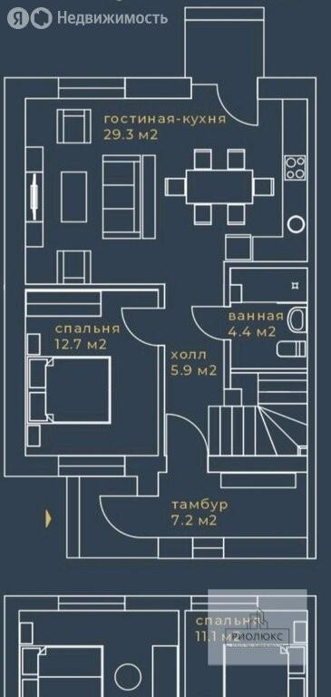 На первом этаже вас встречает светлая гостиная, объединённая с кухней-столовой, — настоящее сердце дома, где так приятно собираться с семьёй и друзьями. Панорамное остекление наполняет интерьер солнечным светом и открывает вид на собственный участок в 4 сотки, который станет чистым листом для создания сада вашей мечты. Здесь же расположена удобная гостевая комната или кабинет.